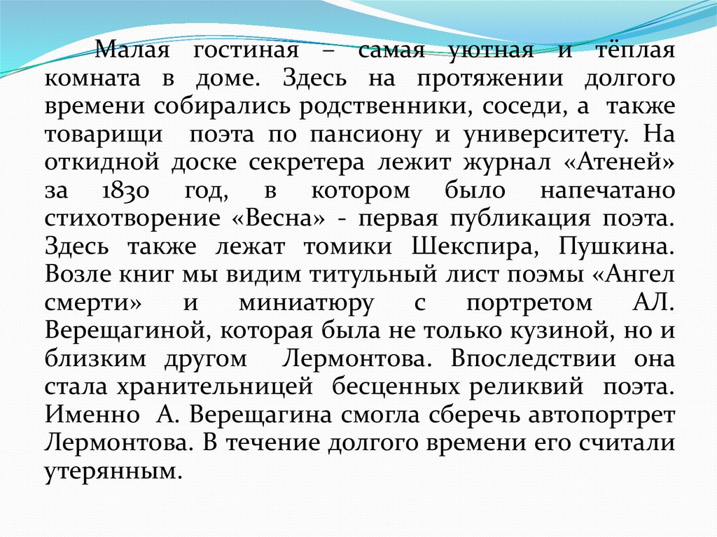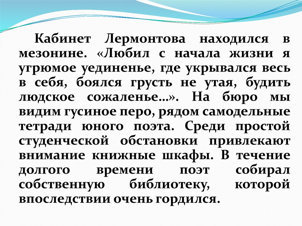 Кабинет Лермонтова находился вмезонине. «Любил с начала жизни я