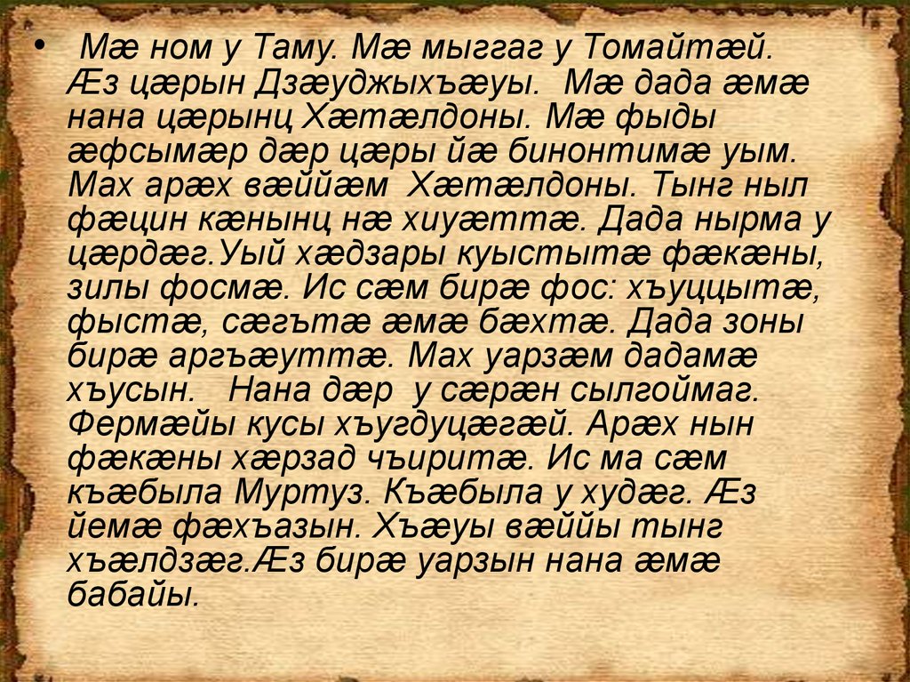 • Мæ ном у Таму. Мæ мыггаг у Томайтæй.Æз цæрын Дзæуджыхъæуы. Мæ дада æмæ