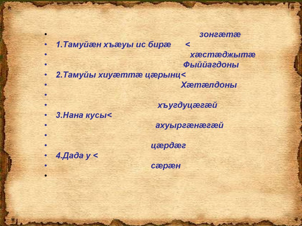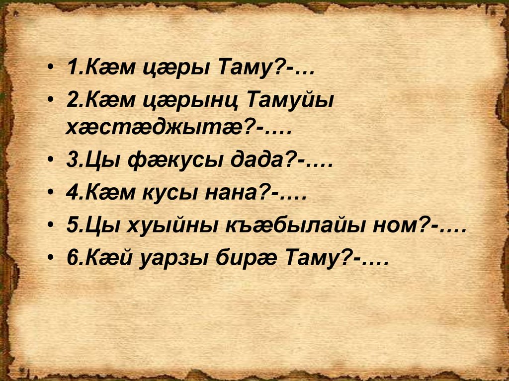 • 1.Кæм цæры Таму?-…• 2.Кæм цæрынц Тамуйы