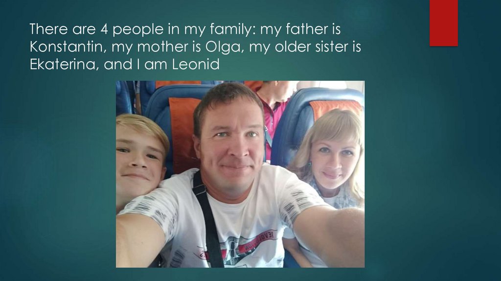 There are 4 people in my family: my father isKonstantin, my mother is Olga, my older sister is