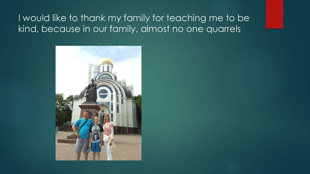 I would like to thank my family for teaching me to bekind, because in our family, almost no one quarrels