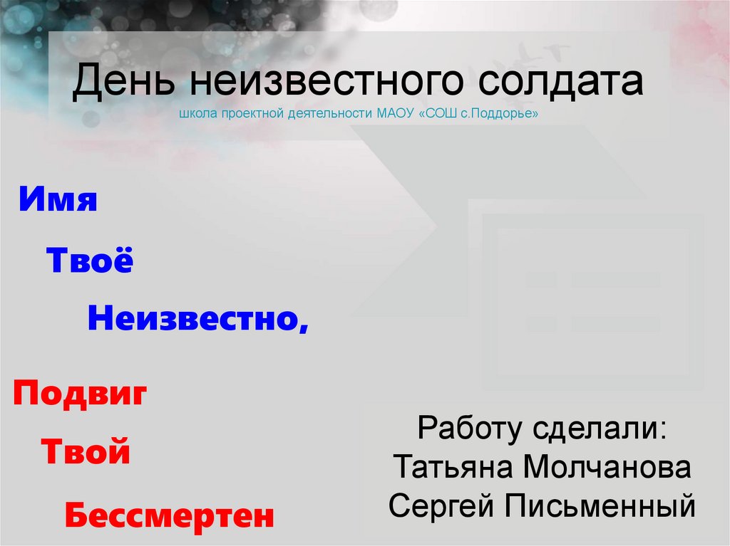 День неизвестного солдаташкола проектной деятельности МАОУ «СОШ с.Поддорье»