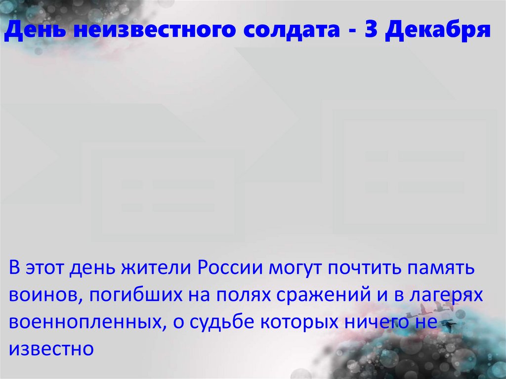 День неизвестного солдата - 3 ДекабряВ этот день жители России могут почтить память