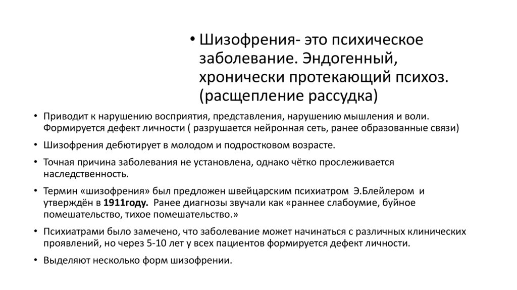 • Термин «шизофрения» был предложен швейцарским психиатром Э.Блейлером и