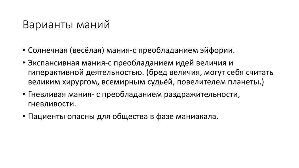 Варианты маний• Солнечная (весёлая) мания-с преобладанием эйфории.