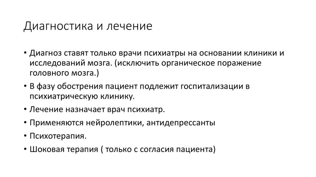Диагностика и лечение• Диагноз ставят только врачи психиатры на основании клиники и
