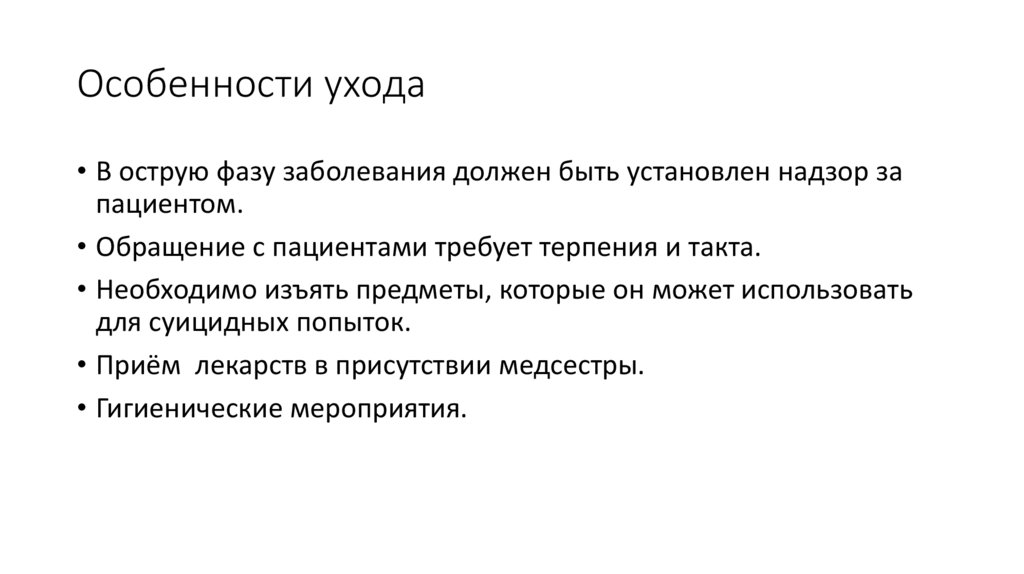 Особенности ухода• В острую фазу заболевания должен быть установлен надзор за