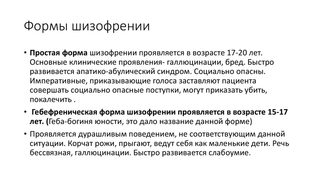 Формы шизофрении• Простая форма шизофрении проявляется в возрасте 17-20 лет.