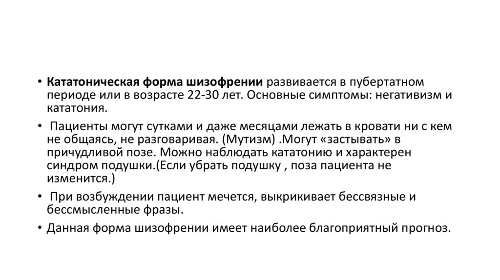 • Кататоническая форма шизофрении развивается в пубертатномпериоде или в возрасте 22-30 лет. Основные симптомы: негативизм и