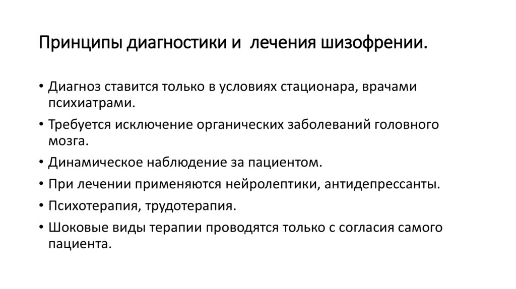 Принципы диагностики и лечения шизофрении.• Диагноз ставится только в условиях стационара, врачами