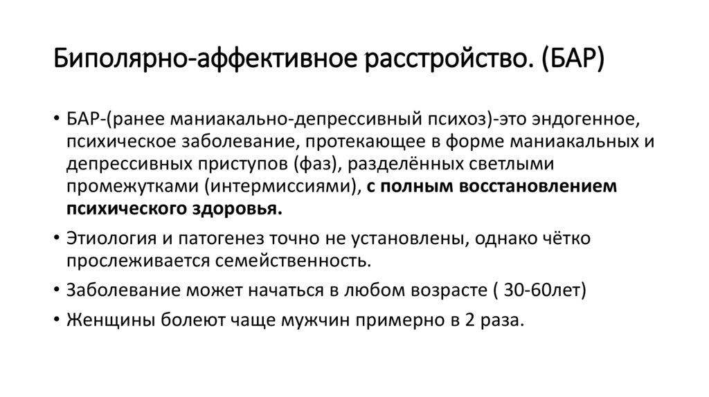 Биполярно-аффективное расстройство. (БАР)• БАР-(ранее маниакально-депрессивный психоз)-это эндогенное,