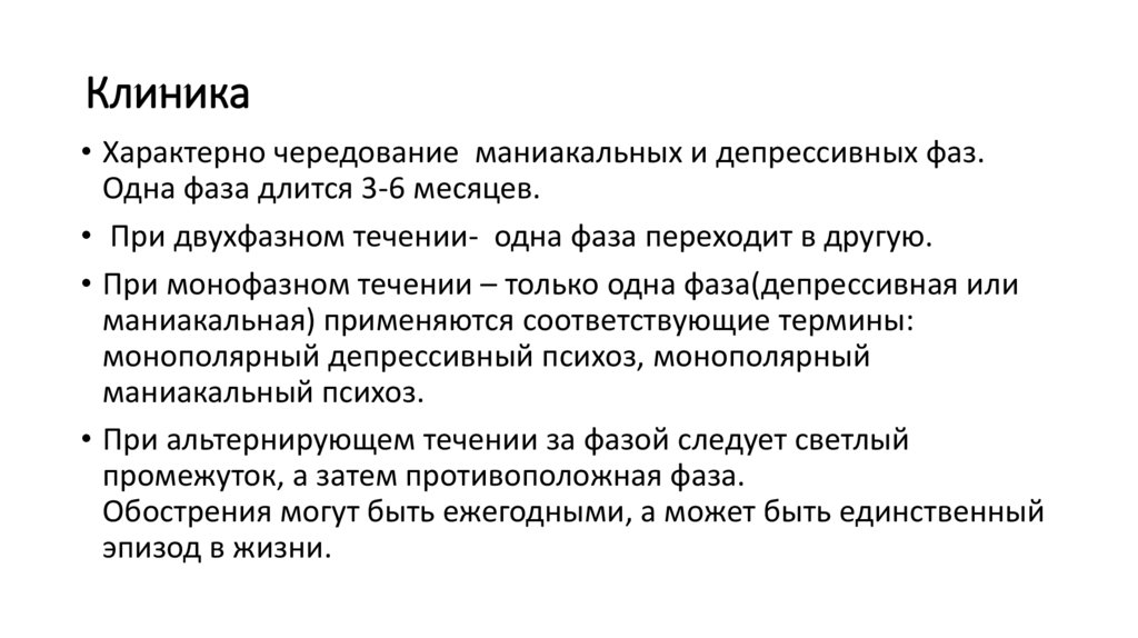 Клиника• Характерно чередование маниакальных и депрессивных фаз.