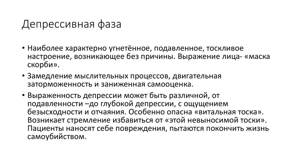 Депрессивная фаза• Наиболее характерно угнетённое, подавленное, тоскливое