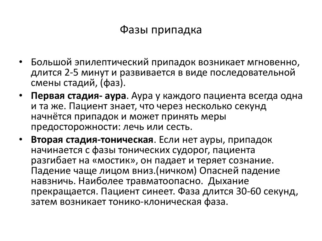 Фазы припадка• Большой эпилептический припадок возникает мгновенно,