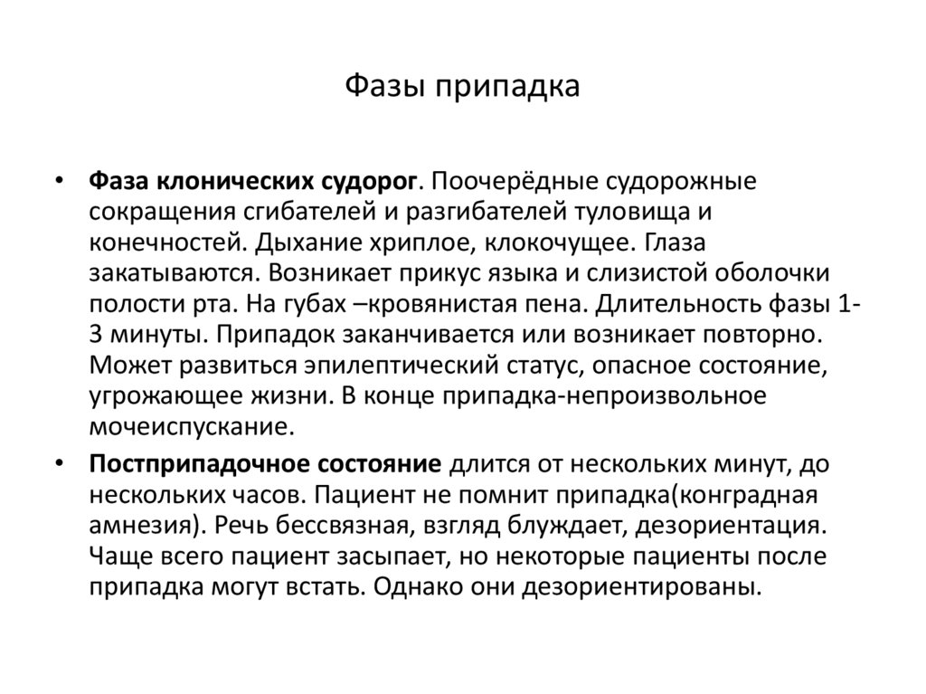 полости рта. На губах –кровянистая пена. Длительность фазы 13 минуты. Припадок заканчивается или возникает повторно.