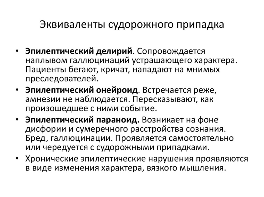 Эквиваленты судорожного припадка• Эпилептический делирий. Сопровождается