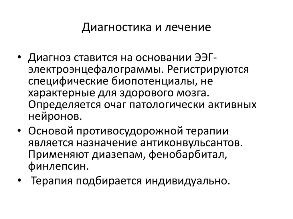 Диагностика и лечение• Диагноз ставится на основании ЭЭГэлектроэнцефалограммы. Регистрируются