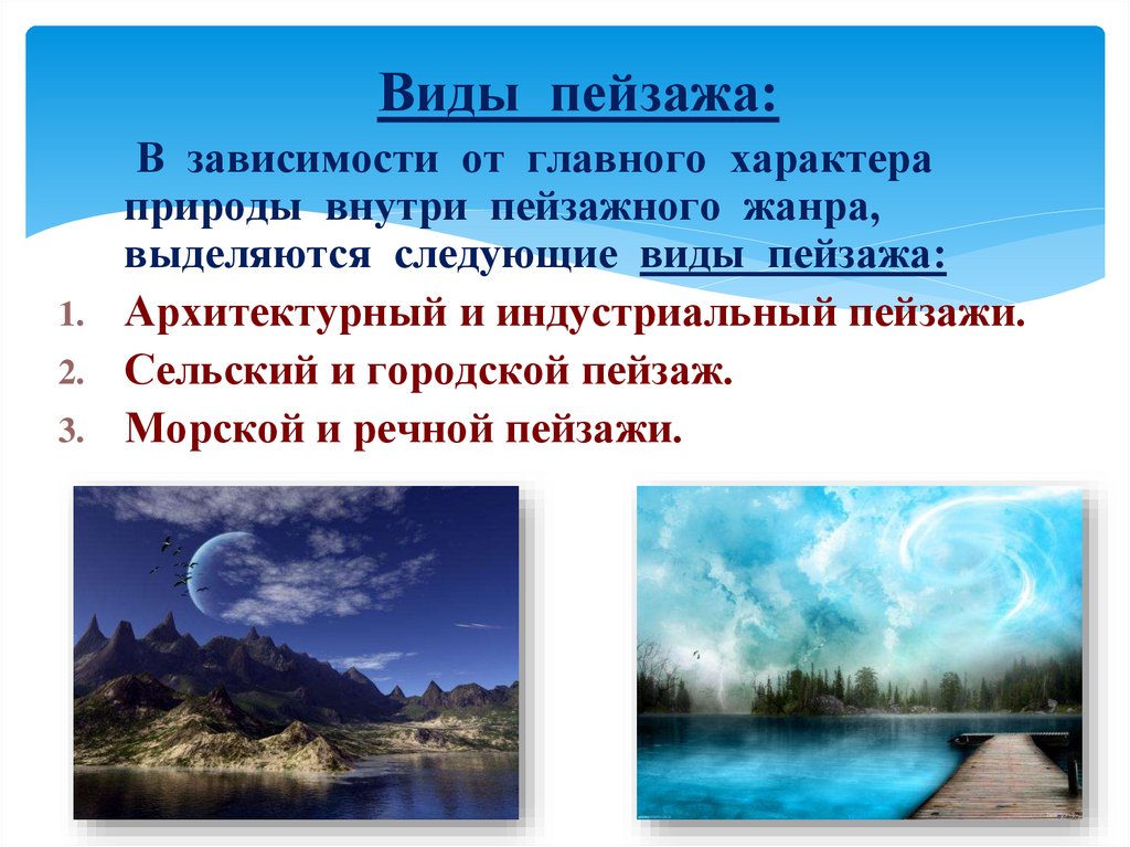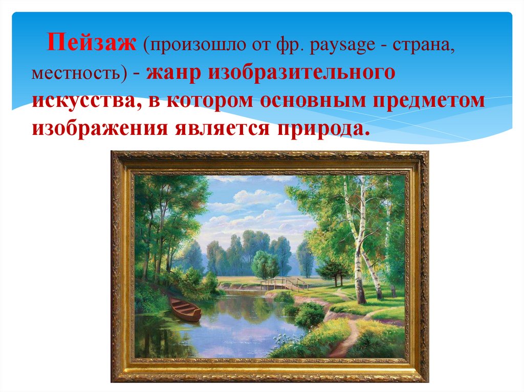 Пейзаж (произошло от фр. paysage - страна,местность) - жанр изобразительного