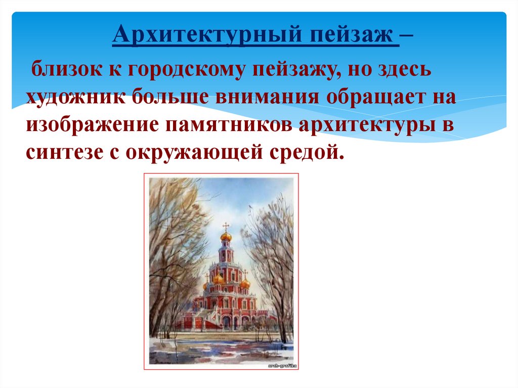 Архитектурный пейзаж –близок к городскому пейзажу, но здесь
