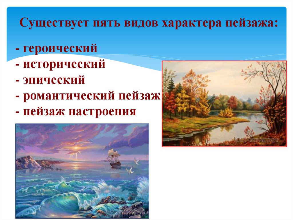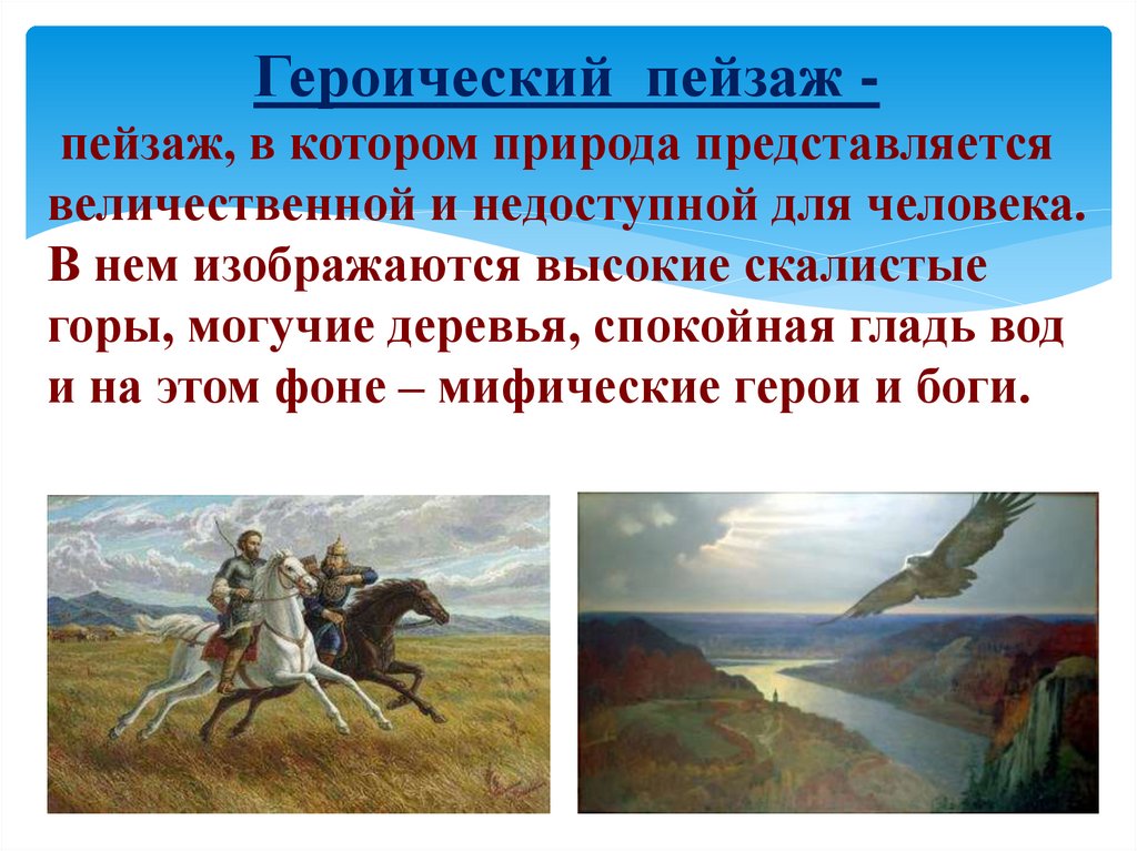 Героический пейзаж пейзаж, в котором природа представляетсявеличественной и недоступной для человека.