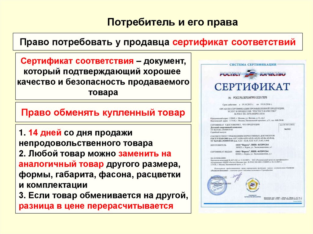 Потребитель и его праваПраво потребовать у продавца сертификат соответствий