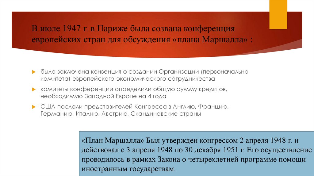 «План Маршалла» Был утвержден конгрессом 2 апреля 1948 г. и