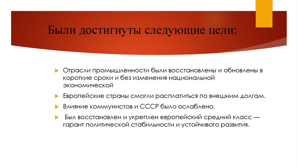 Были достигнуты следующие цели:Отрасли промышленности были восстановлены и обновлены в