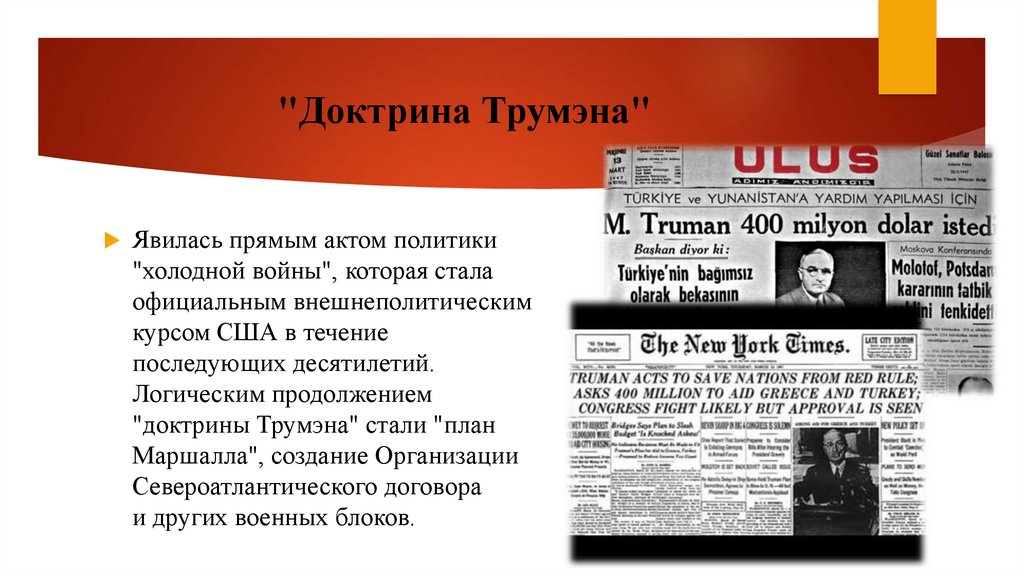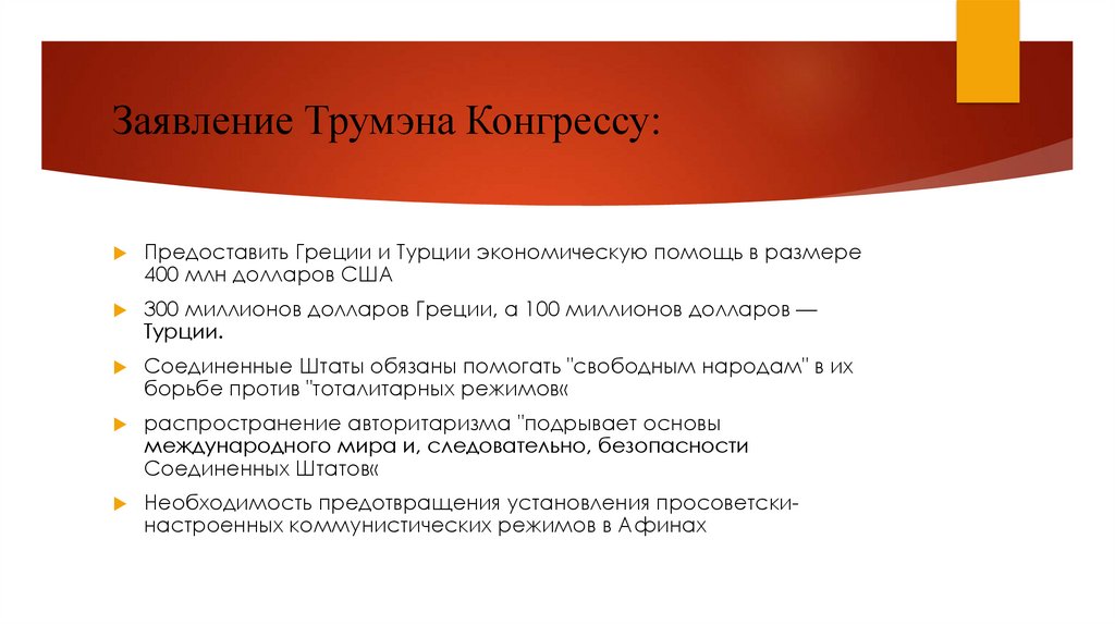 Заявление Трумэна Конгрессу:Предоставить Греции и Турции экономическую помощь в размере