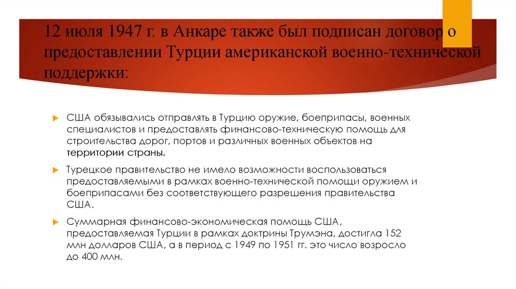 12 июля 1947 г. в Анкаре также был подписан договор опредоставлении Турции американской военно-технической