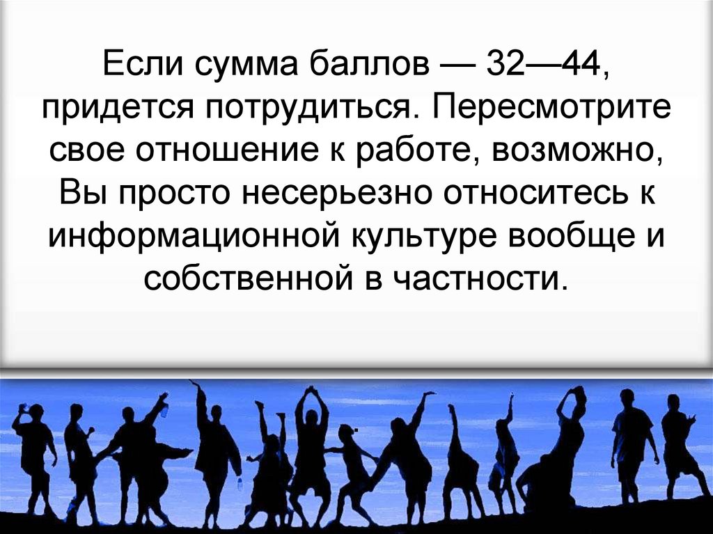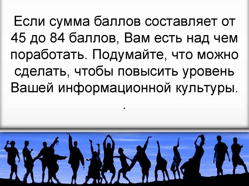 Если сумма баллов составляет от45 до 84 баллов, Вам есть над чем