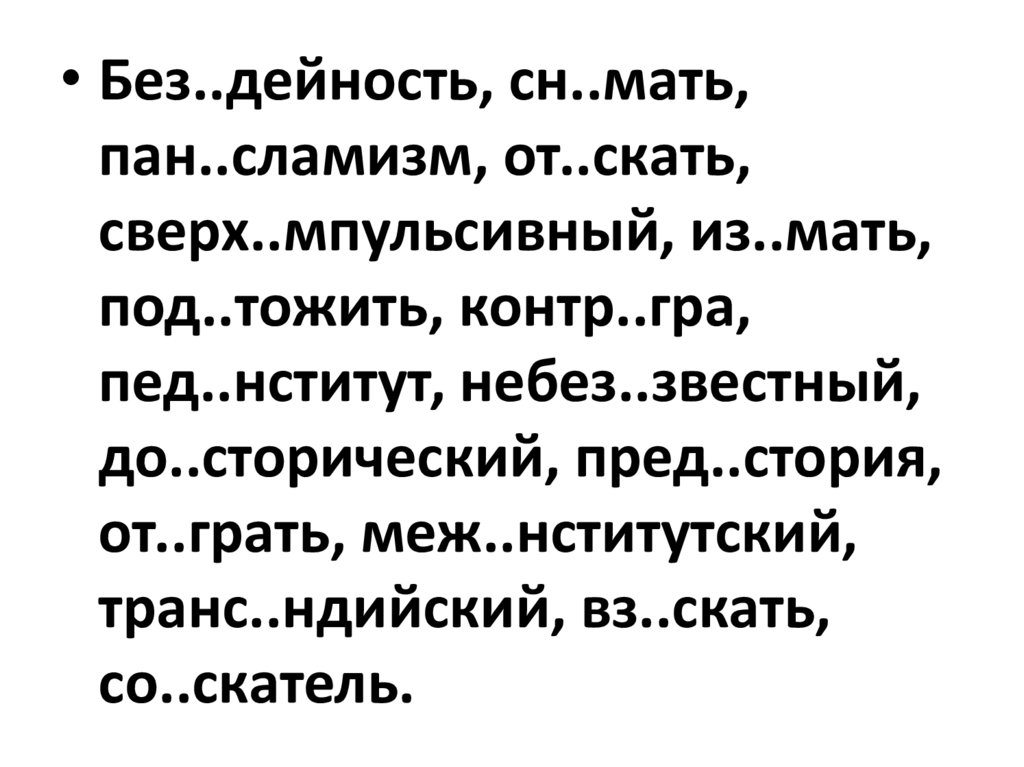 • Без..дейность, сн..мать,пан..сламизм, от..скать,