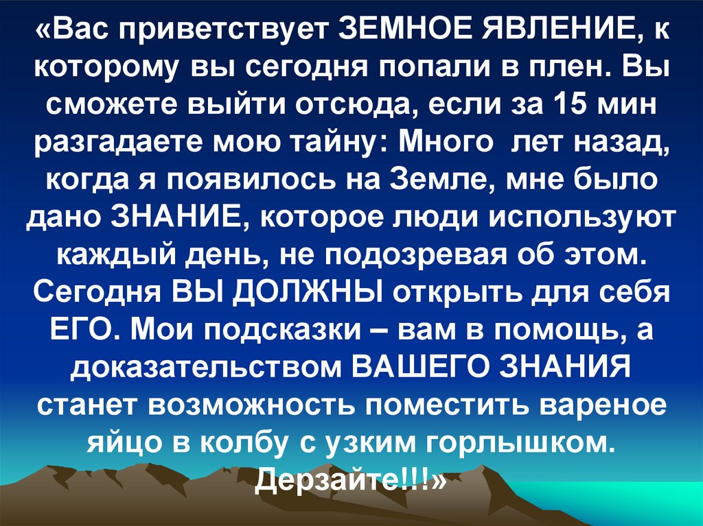 «Вас приветствует ЗЕМНОЕ ЯВЛЕНИЕ, ккоторому вы сегодня попали в плен. Вы