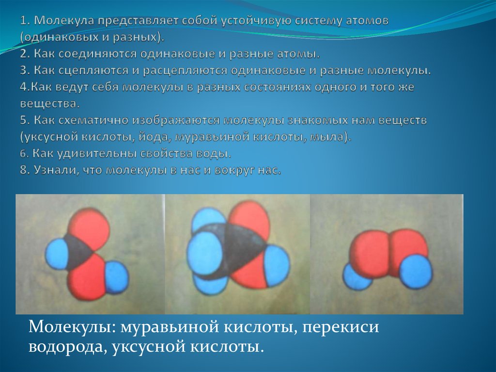 Молекулы: муравьиной кислоты, перекисиводорода, уксусной кислоты.