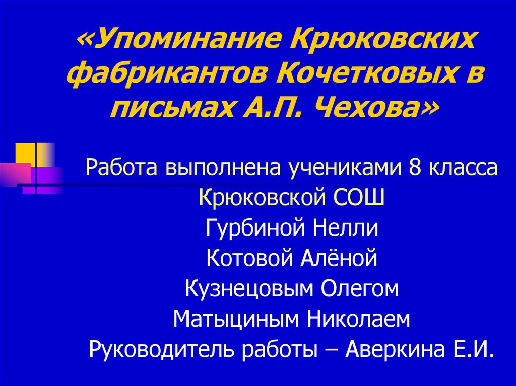 1. «Упоминание Крюковских фабрикантов Кочетковых в письмах А.П. Чехова»