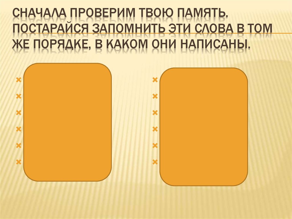 СНАЧАЛА ПРОВЕРИМ ТВОЮ ПАМЯТЬ.ПОСТАРАЙСЯ ЗАПОМНИТЬ ЭТИ СЛОВА В ТОМ