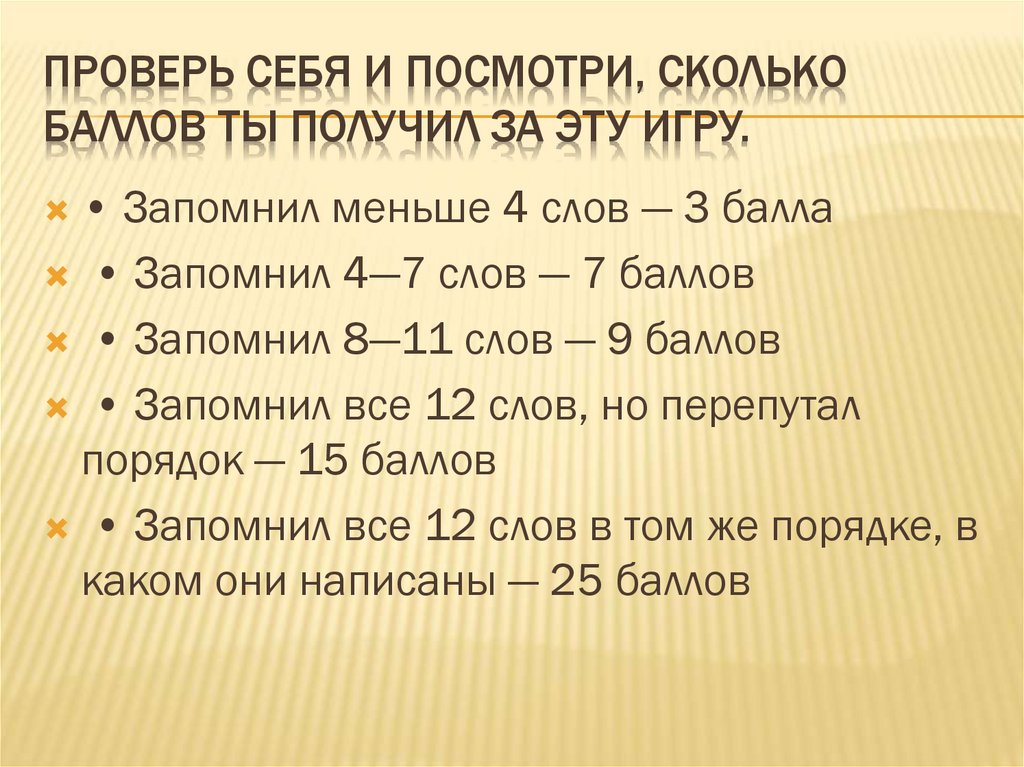 • Запомнил 4—7 слов — 7 баллов