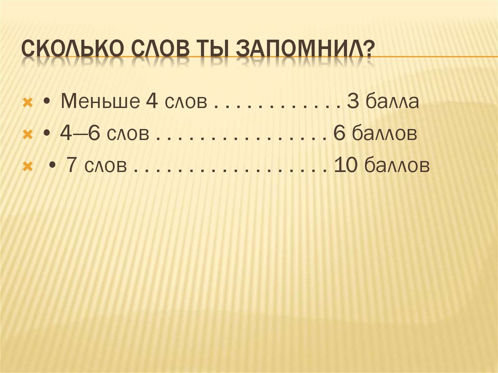 СКОЛЬКО СЛОВ ТЫ ЗАПОМНИЛ?• Меньше 4 слов . . . . . . . . . . . . 3 балла