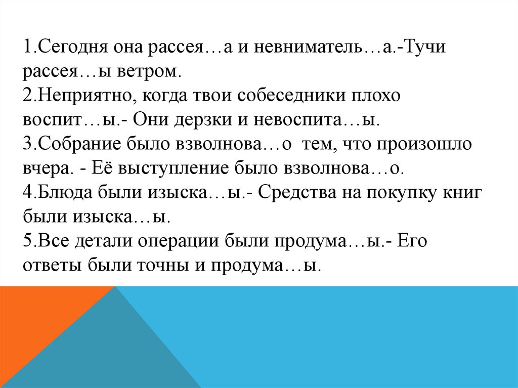 1.Сегодня она рассея…а и невниматель…а.-Тучирассея…ы ветром.