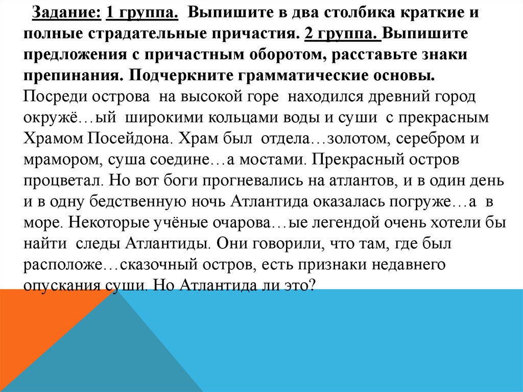Задание: 1 группа. Выпишите в два столбика краткие иполные страдательные причастия. 2 группа. Выпишите