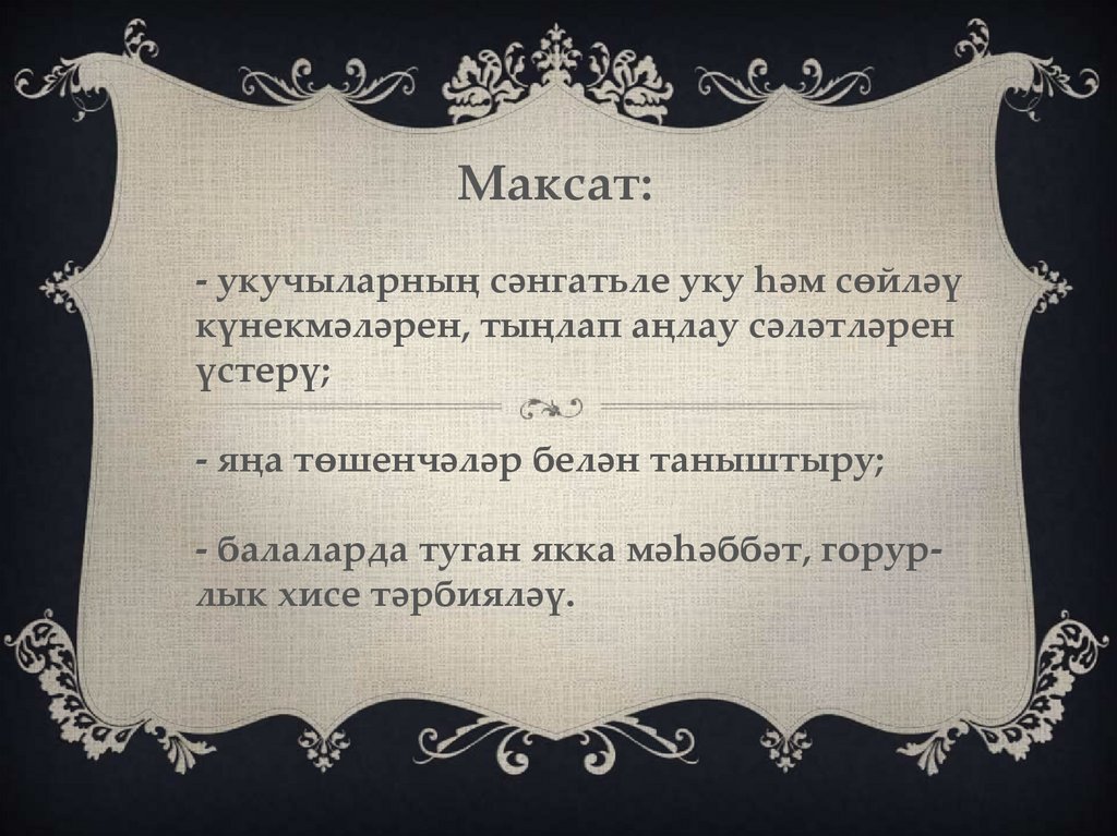 - балаларда туган якка мәһәббәт, горурлык хисе тәрбияләү.