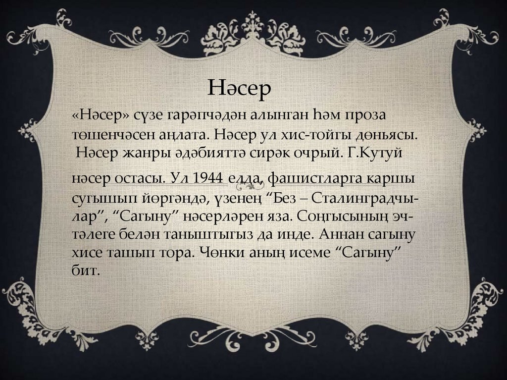 Нәсер жанры әдәбияттә сирәк очрый. Г.Кутуй