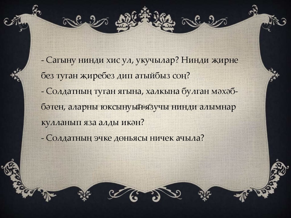 - Солдатның туган ягына, халкына булган мәхәббәтен, аларны юксынуын язучы нинди алымнар