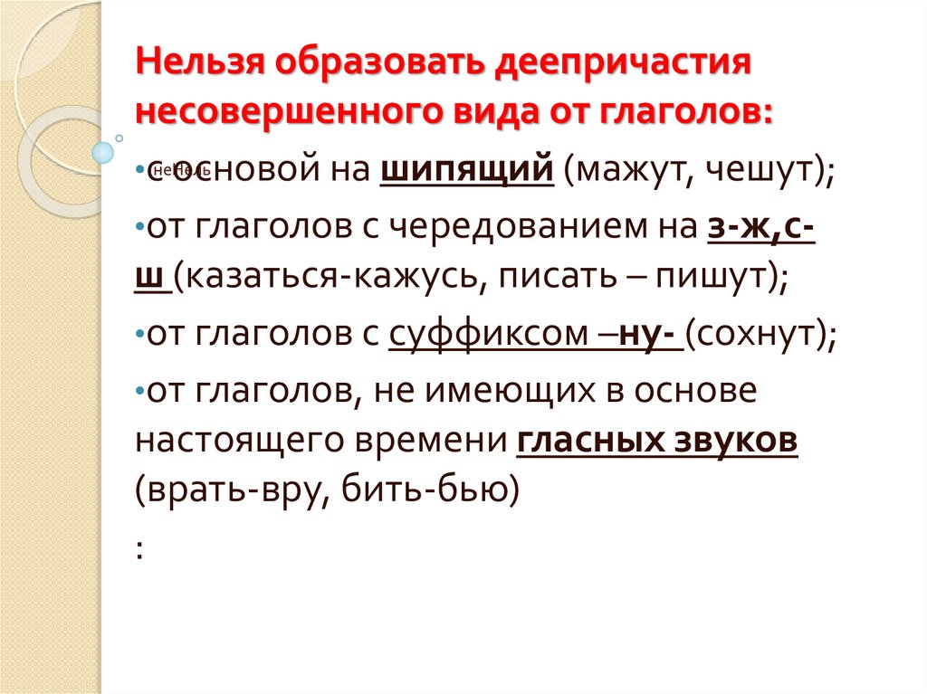 Нельзя образовать деепричастиянесовершенного вида от глаголов: