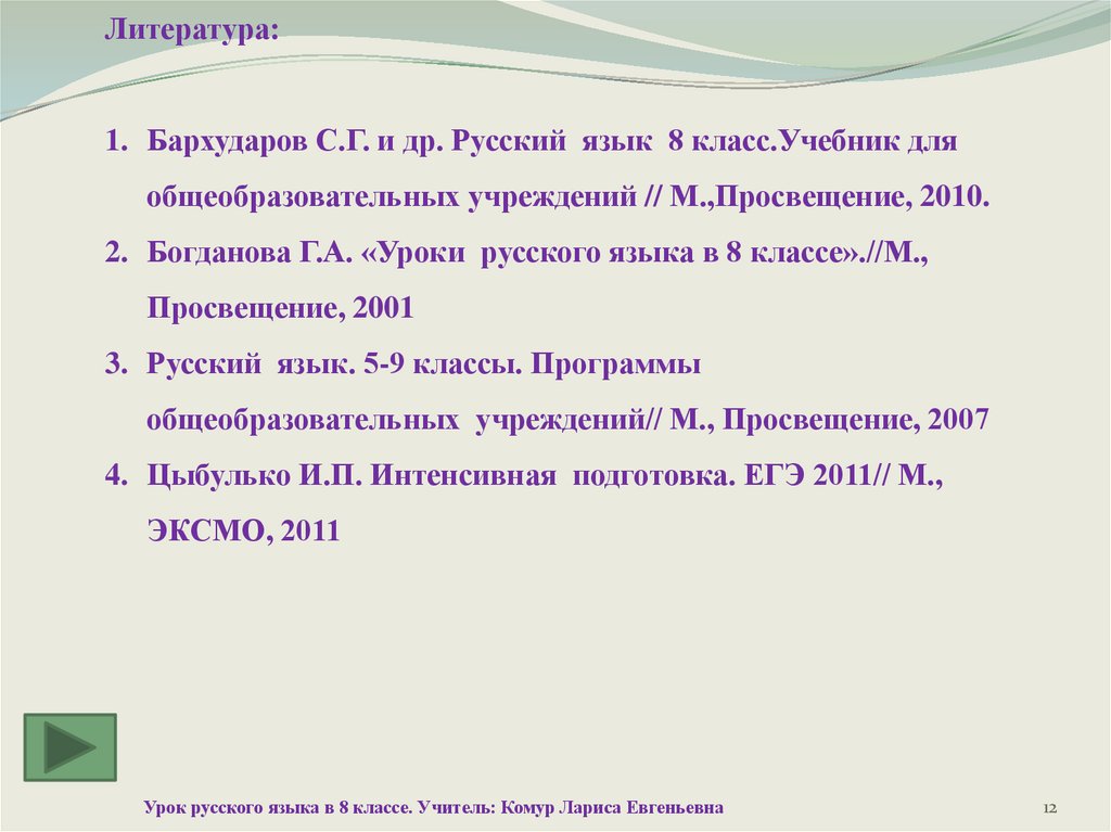 Литература:1. Бархударов С.Г. и др. Русский язык 8 класс.Учебник для
