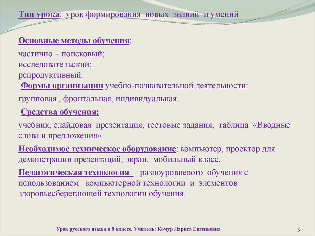 Урок русского языка в 8 классе. Учитель: Комур Лариса Евгеньевна