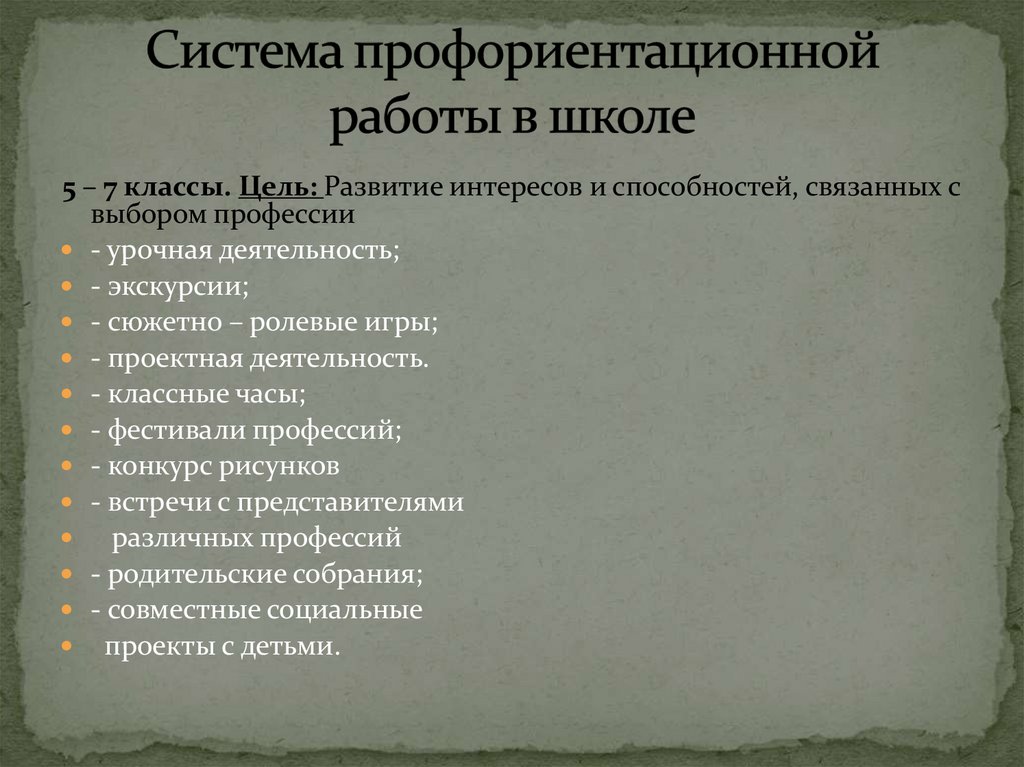 5 – 7 классы. Цель: Развитие интересов и способностей, связанных свыбором профессии