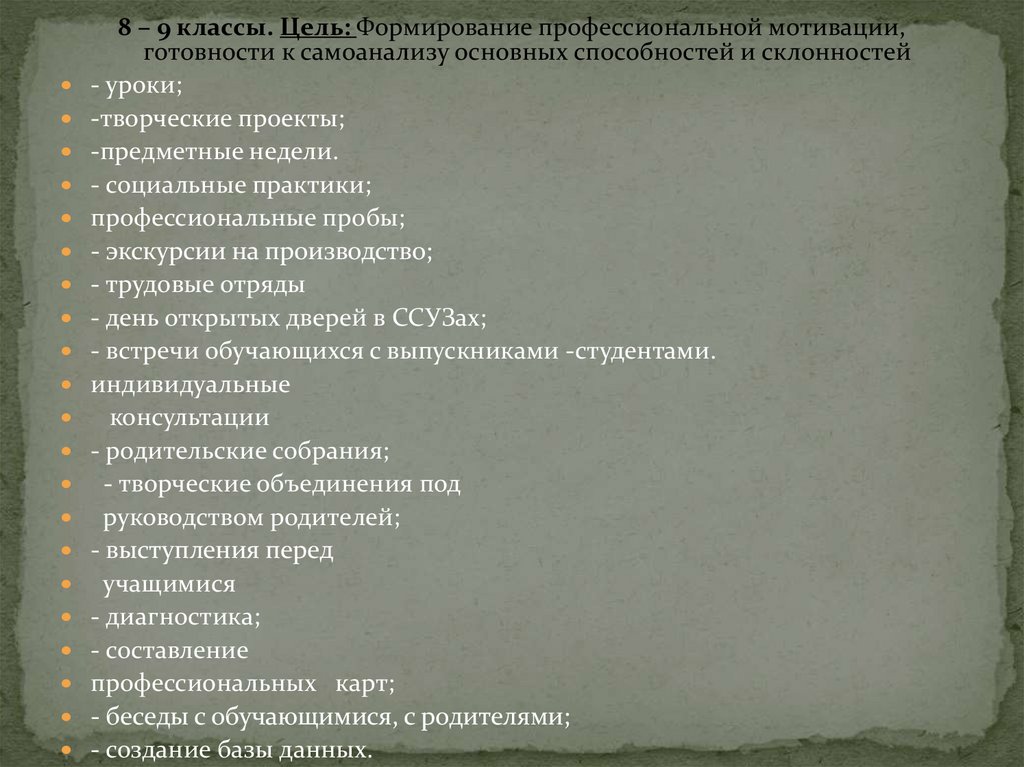 8 – 9 классы. Цель: Формирование профессиональной мотивации,готовности к самоанализу основных способностей и склонностей