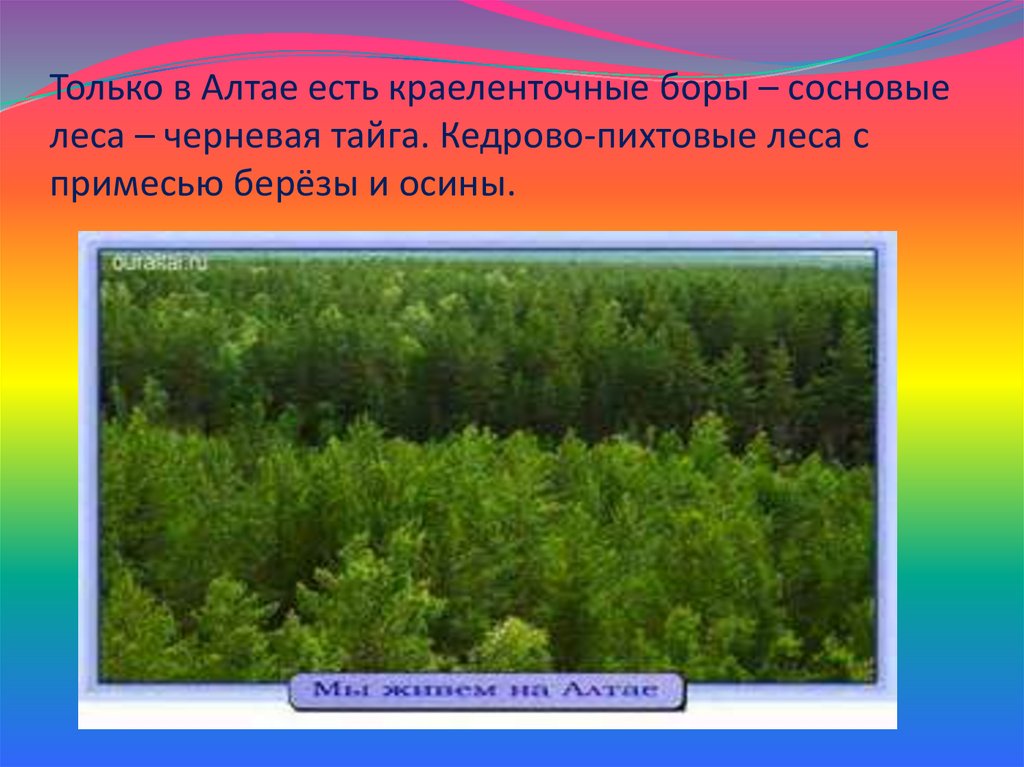 Только в Алтае есть краеленточные боры – сосновыелеса – черневая тайга. Кедрово-пихтовые леса с