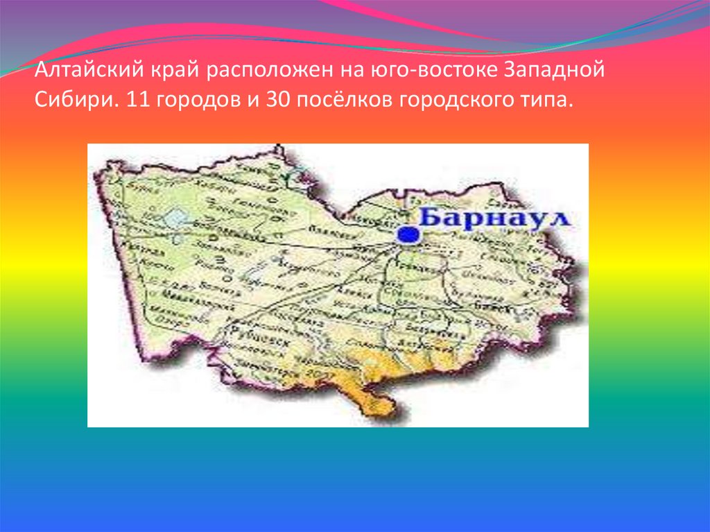 Алтайский край расположен на юго-востоке ЗападнойСибири. 11 городов и 30 посёлков городского типа.
