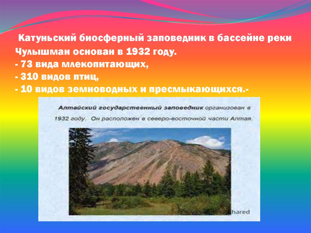 Катуньский биосферный заповедник в бассейне рекиЧулышман основан в 1932 году.